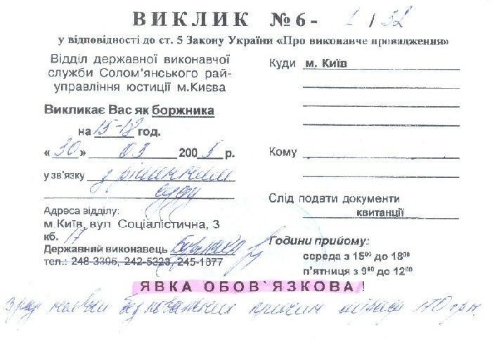 В мае! 2004 пришло первое письмо из Исполнительной службы. Мол заплатите пжалуста 7.50 за нарушение и нам за работу 83 копейки, по-моему. Ну естессно это был "подкидыш" в ящик почтовый. Забил...Да - копия решения суда в сроки 2 месяца вложилась и была приложена в письме. Проходит месяц - опять письмо уже с красными подчеркиваниями - мол вы можете всего лишиться! Срочно заплатите штраф - иначе расстрел с конфискацией. Забил...Через некоторое время опять подкидыш - мля мля мля и срочно плати. А то повесим на Крещатике. Ну сжалился - виноват ведь был. Пошел платить. 7.50 взяли без проблем, а вот р\с Исполнительной службы неисвестен для сберкассы на Львовской пл. Как? - а вот так!. Ну я опять забил - штраф то оплачен. Млин - опять пришло письмо через месяц-другой...Мол не заплатили нам 83 копейки - капец вам! Это сколько ж они на мя потратили денех по конвертам с марками? Они ли? Я еще раз забил - ну поняли что было дальше? Опять письмо...Я уже и звонил им (на Саксаганского находяться) спрашивать что и как - дозвониться нереально. Одни раз дозвонился - инспектор в отпуске и приезжайте оплатить... Ну после последнего письма решил 83 копейки заплатить, чтобы отвязались ироды...родные уже пугались письмам в почтовом ящике с такими печятями и адресами на конвертах. Еле нашел их на Саксаганского. Какие-то фирмы снизу - они на 4 этаже. Захожу - классика из совейцких фильмов...куча папок и столы друг к другу. Женщина мне в матери годиться. Так и так - ворчание... -ну хотел же заплатить, дык вашего р\с никто не знает. -а мы с одним банком работаем, в ответ. (то ли Приват, то ли Правекс...не помню). -ну дык хоть в письме бы реквизиты прописали... -нуууу...достали вы все уже...звоните и уточняйте