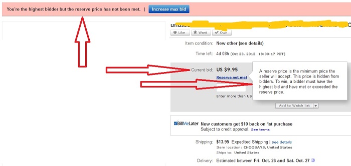 Заинтересовал один лот. Но в нём цена как-то по-хитрому прописана. Под ценой лота (пусть будет 10$) - примечание "Reserve price not met". В выпадающем окне след. инфа: "A reserve price is the minimum price the seller will accept. This price is hidden from bidders. To win, a bidder must have the highest bid and have met or exceeded the reserve price." Ставок до этого не было, соотв. я поставил первую, 10$, и max bid задал 20$. После этого над описанием лота сообщение: "You're the highest bidder but the reserve price has not been met."