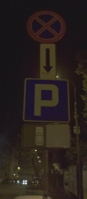 На фотке мы имеем: 1) Знак 3.34 «Зупинку заборонено». 2) Табличку до знаку п1. 7.2.3 "Зона дії" 3) Знак 5.38 «Місце для стоянки». 4) Самопальну табличку, яка призначенням схожа на серію 7.6.1 — 7.6.5 «Спосіб поставлення транспортного засобу на стоянку».