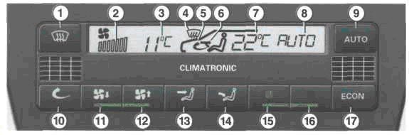 Кнопки 9 - автоматический режим 10 - циркуляция воздуха 11 - кнопка для понижения частоты вращения вентилят. и для выклю¬чения кондиц. воздуха „OFF" 12 - кнопка для повышения частоты вращения вентилят. и кнопка для включ. кондиц. „Climatronic" 13 - направление тока воздуха к вер- хней части тела человека 14- направление тока воздуха в прос¬ транство для ног 15- понижение температуры 16- повышение температуры 17- „ECON" (компрессор выключен)