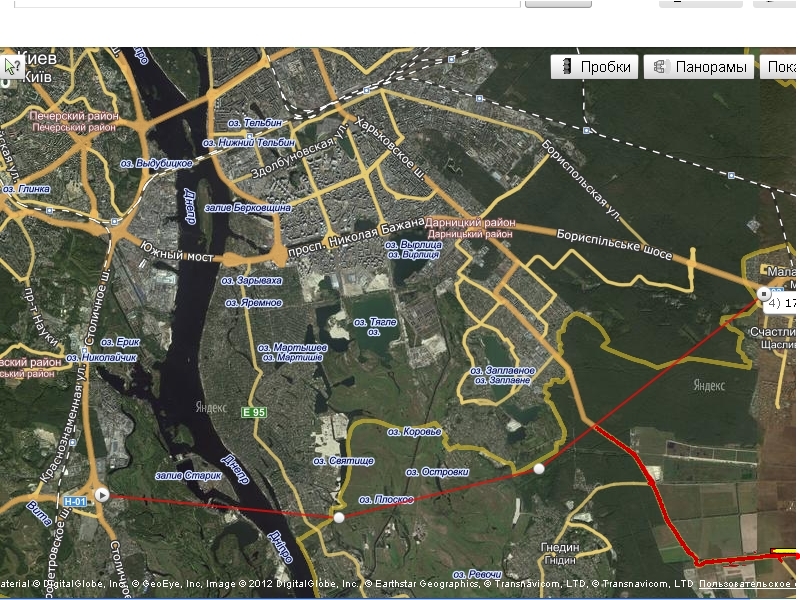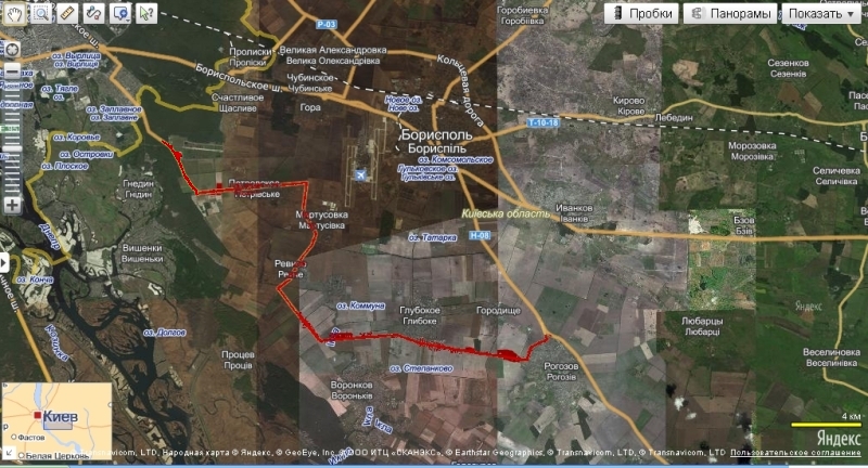 Ты не понял, я на легковой машине объезжал Борисполь, сворачивая в "Горе" направо вот выделил красным дорогу по которой фуры могут объезжать Борисполь с другой стороны по направлению в Днепр, Черкассы