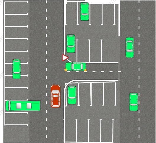 Кто знает правильный вариант дорожной ситуации? Это парковка возле супермаркета. Салатовые автомобили заезжают на парковку со стороны дороги. Автомобиль красного цвета движется по парковке прямо.