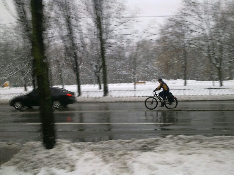 Мож какойто велопутешественник, вон сумки сзади,на веле вокруг света за 800 дней вот и не прощитал что в декабре киев может снегом завалить.