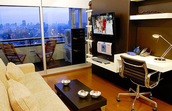 шкаф - одоробло. Максимум - закажу длинную тумбу под ТВ и она-же будет столом. Как-то так: