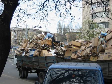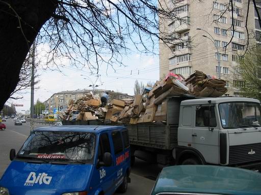 Ехал сегодня днем с Сырца на Севастопольскую через Шулявку естественно. Получил море удовольствия от слалома между стопками макулатуры на дороге. Да и не я один имел море удовольствия. Плюс засратый край дороги по всей длине. Вот и причина. Догнал возле кинотеатра "Ереван". У водилы отмазка - он не грузил. Шо дали - то везу.