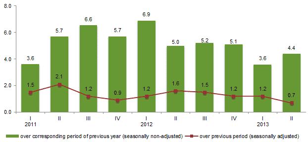 Прирост ВВП Латвии во втором квартале 2013 года по сравнению с аналогичным периодом 2012 года составил 4,4%,