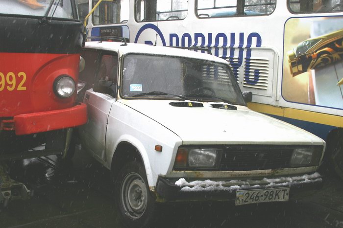А в этой ситуации явно водилы в трамвае прикольнулись над шофером. Реально какойто из них не остановился и не дал завершить маневр жигуленку.