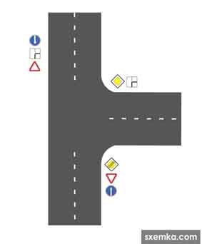 Вот так было бы совсем правильно. Но так получается потратили 6 знаков и 2 таблички. В стартовом сообщении 5 знаков и 2 таблички. Аж на целый знак меньше! Но думаю, что там вначале висел "главная" и табличка. Потом, когда поворот налево закрыли, то "главная" заменили на "уступи" и повесили "прямо"