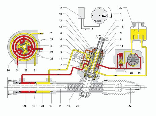 "Продукт высшего класса представляет собой модель ZF Servotronic® 2, работа которой благодаря использованию самой современной электроники напрямую зависит от скорости. При этом сигнал о скорости, поступающий от электронного спидометра или системы АБС анализируется микропроцессором и направляется на электрогидравлический преобразователь, который в свою очередь определяет гидравлическое действие на клапан, который регулирует момент усилия руля."