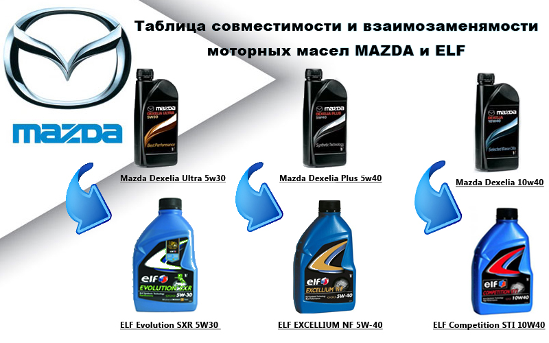 Вязость 10w40 абсолютно практически не может влиять на скорость завода двигателя. Ну не солидол же у Вас там залит Скорее всего, чисто субъективный фактор. Кто-то сверху писал, что масло Mazda это то-ли Elf, то-ли Total. Правильно - масло Mazda - это масло Эльф. Как и Ниссан, в прочем. (прилагаю картинку идентичности и взаимозаменяемости масел Mazda-Elf) 10w40 - отлично подходит для данного движка. Официальный каталог Эльфа рекомендует именно его, как альтернативу 5w30. Все зависит от пробега и температур в которых используется данный агрегат. Вообще, после 200 тыс, даже и рекомендуется лить больше вязкость.