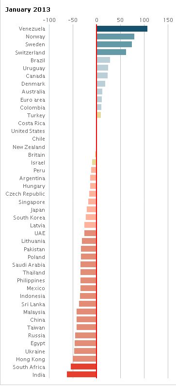 Индекс "Биг Мака" свидетельствует, что валюты около половины из более 60 исследуемых стран недооценены к доллару, а завышенный курс - у 11 государств, лидером среди которых является Венесуэла. Ее национальный боливар, согласно индексу, переоценен почти на 110%.