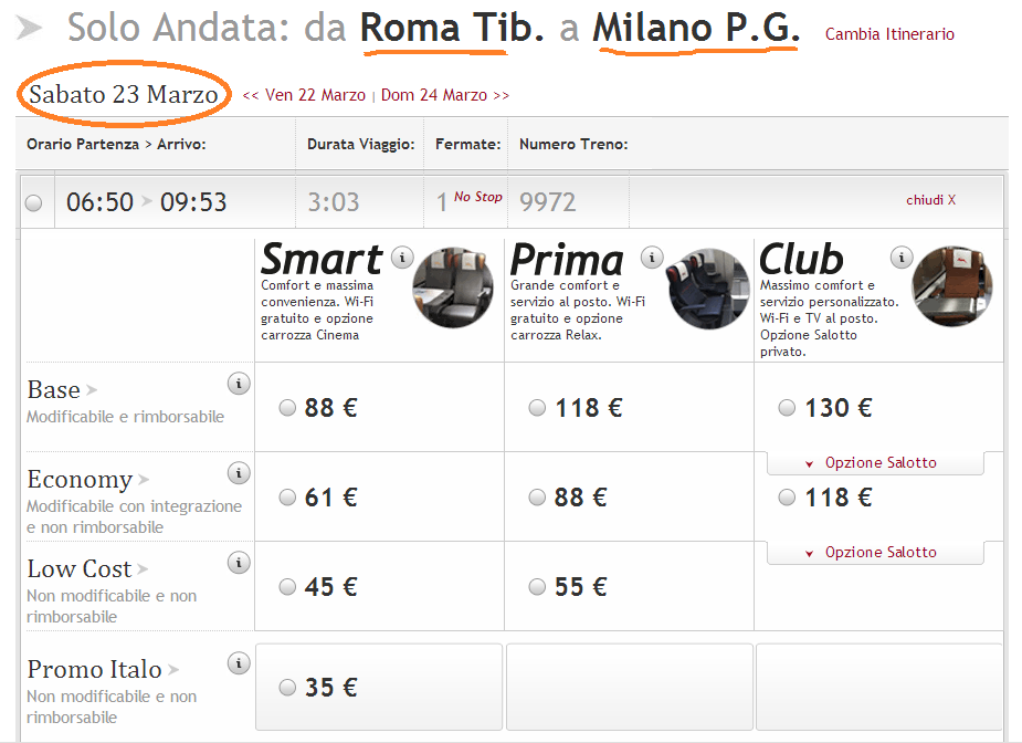 Ну там чем раньше берёшь, тем меньше можно заплатить. Вот навскидку суббота в марте через месяц, виден полный расклад по ценам (реально Рим-Милан за 29Е поймать, 9Е только на более короткие расстояния, кмк). Плюс ещё приятный вариант: если уж нет самого дешёвого варианта, то можно в точно те же деньги взять билеты получше, см. на скриншоте класс Премиум - за те же деньги! - а ехать приятней, больше пространства, меньше толпы, кофе на шару