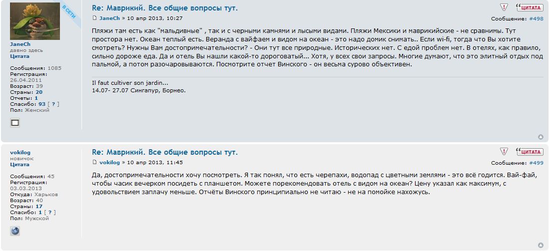 Я не читал отчёта Винского о Маврикии. Я прочёл его отчёт о Кении и дал себе зарок не читать больше этих высеров. Но Маврикий таки не очень впечатляет, думаю над тем, стоит ли делать там стоп-овер или пролететь мимо.