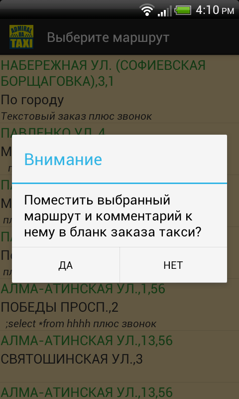 Обратите внимание, что в закладке «Маршруты» сохраняется маршрут расчёта тарифа или поездки с информацией, что была введена в поле «Примечания для водителя по заказу». Поэтому, осуществляя реальный заказ такси через закладку «Маршруты» по ранее введённому «тестовому» маршруту, не забудьте в форме заказа удалить примечание о тесте.