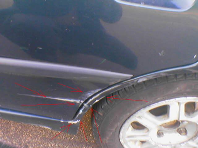 См. фото. Больше всего пострадала задняя колесная арка (там даже складка металла образовалась). Повреждения отмечены стрелками. Дверь открывается нормально, ничего не повело. Краска - зеленый перламутр под лаком родная пыжовская. Страховки у меня нет. У него ГО кажется нет (по крайней мере полиса не нашли). Менты все оформили, но парень вроде и не отмазывается