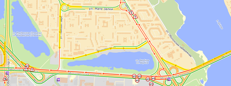 Перед перекрестком пр-т Московский - пр-т Оболонский остановился троллейбус (ДТП или поломка). Он же собрал за собой своих собратьев. Дальше свободно.