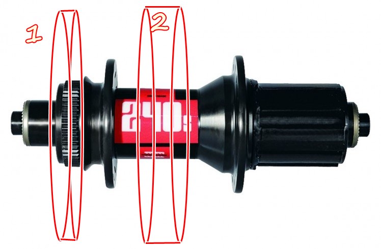 Если уж такое мантулить, то или с другой стороны от кассеты (1), причем - он же там звезду ставил для допцепи - чего не сообразить? Или, самое правильное - между спицами (2) нужно помозговать, как управлять этим, но место самое удачное.