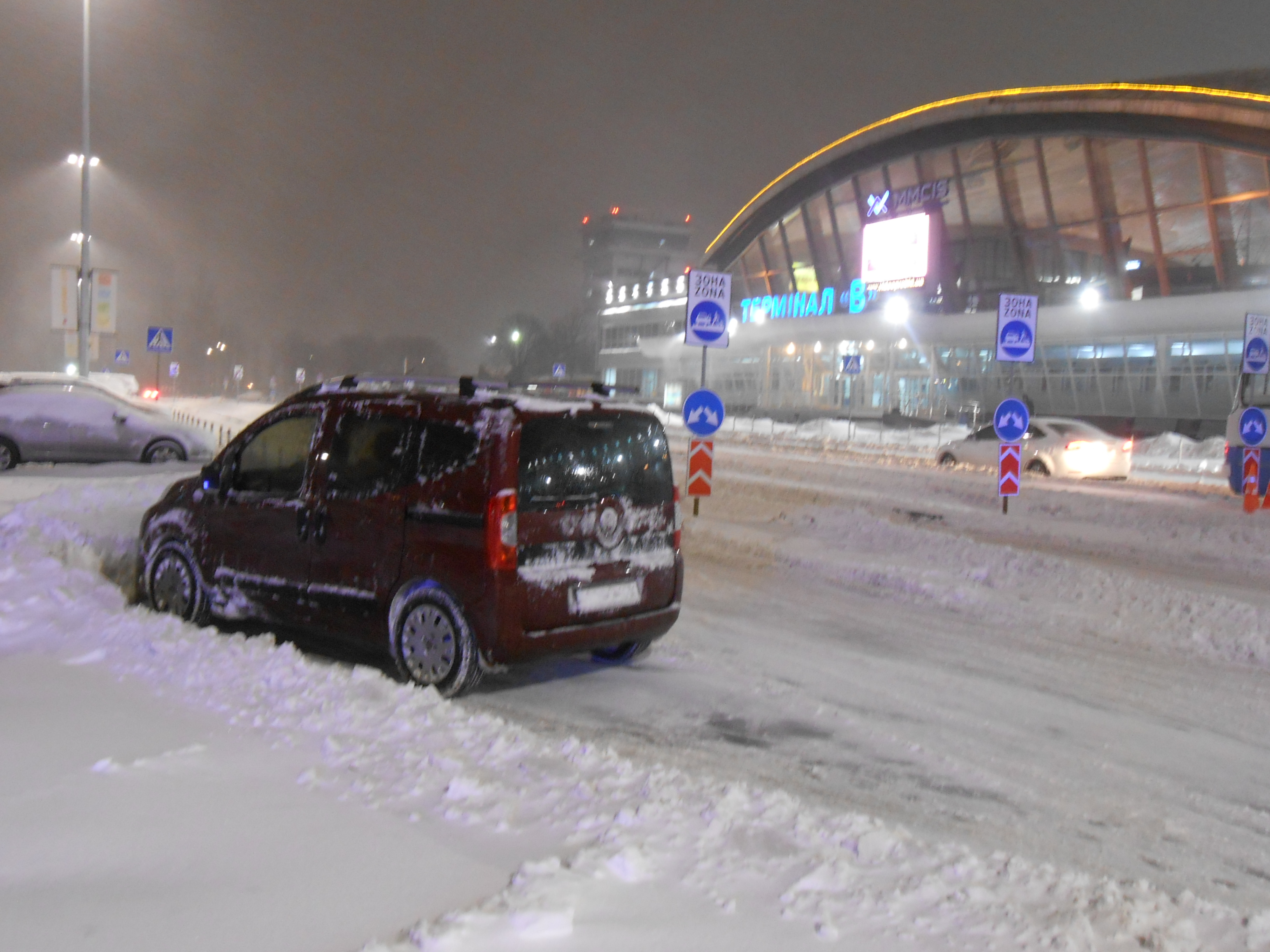 Выбор в пользу Скайбаса сделан сознательно. Подкупило обещание на их сайте "ездить по расписанию в любую погоду". Перезванивала накануне,- да, ездим, говорят. Утром 23-го сказали, что автобус идет полтора часа вместо 45 минут, делайте поправку. Мониторила "пробки" в и-нете перед выездом - весь мой маршрут был зеленый. НО... Урицкого-Гринченко проехали нормально, объезжая вереницы заснеженных троллейбусов (со спящими водителями внутри!) и людей, бредущих по дорогам - ОТ не ходит, тротуары заметены (кому по колено, кому выше) А вот перед Южным встали на 2(!) часа. Для всех забраться на подъем - проблема, а для одного автобуса она стала непреодолимой Дорога сузилась до одной полосы. "Расслабиться и получать удовольствие" помогла информация из дому, что большинство рейсов уже "скасовано" и мы никуда не опаздываем. В аэропорту совершила обзорную экскурсию по терминалу Д, прослушала разноголосые истерики несостоявшихся попутчиков, адресованные ни в чем не виноватой представительнице авиалиний. Милая девушка героически сохраняла самообладание. Наши люди считают, чем громче они орут, тем позитивнее будет результат. Наконец всех громкоорущих поставили в "лист ожидания", кого на воскресный вечер, кого на понедельник. Я же совсем "скасувала" свой перелет, т.к. собиралась лететь всего на пару дней. Сказали, вернут деньги на карту, если напишу запрос на сайте авиакомпании. Попробую, пока такого опыта нет. Чтоб уехать обратно в Киев, пришлось шаттликом вернуться к терминалу "Б", т.к. СкайБас проскакивал мимо "Д" битком набитый. И снова стоим в пробке на Б.трассе! Причина - бесконечная череда стоящих в ДВА ряда фур. Наконец - Киев! Наконец - метро! П.С. Попутчики говорили, что даже Скай-такси вызвать было невозможно Впрочем, я видела пару машинок. Одну из них - стоящую в пробке рядом.