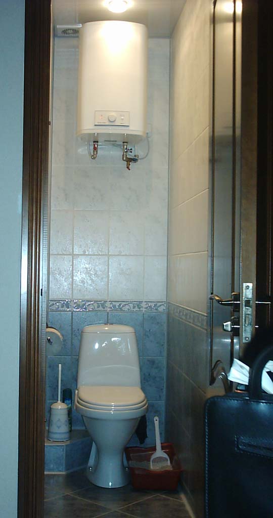 Глянь фотку. Ми теж спочатку думали в горизонтальне положення його поставити. Але разом з патрубками і трубками він не вміщався в туалет (раніше тут була кладовка). Тому поставили вертикально. І не жалкуємо. Він ні стоячим ні сидячим (сорі за подробиці ) не заважає. Це при тому, що унітаз практично впритик до задньої стіни соїть.