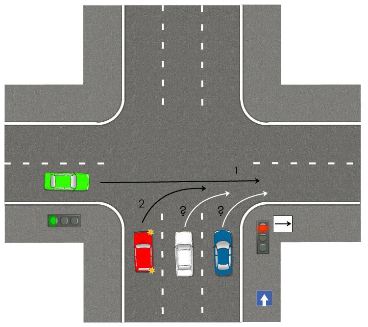 вот не понятно почему поворот из крайнего левого положения связали с дорогами с односторонним движением, и, главное, с каким направленим на «картонке»? в голову приходит вот такая схема (стрелка на «картонке» направо), но к ней много вопросов…