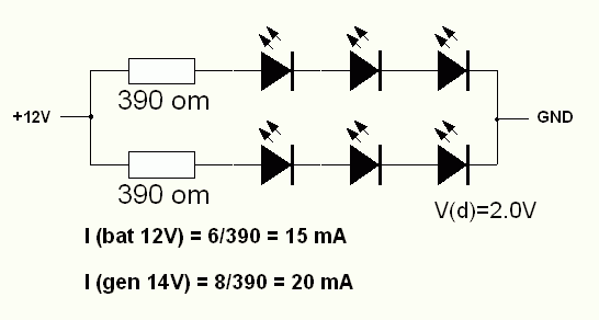 Объясню на примере. Допустим, светодиодов 6 штук (часто встречается в автомобильных лампах). Исходя из рабочего тока = 20 ma, схема их включения может выглядеть так (номинал резистора может отличаться).