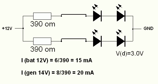 Допустим, достанешь белые (желтые) диоды с падением около 3V (распространенные 3.0 – 3.2). Тогда перепаиваешь и меняешь номинал резисторов. Но, при этом, возрастет разница в яркости свечения в режимах питания (батарея / генератор). Если это не пилит, то схема ниже.