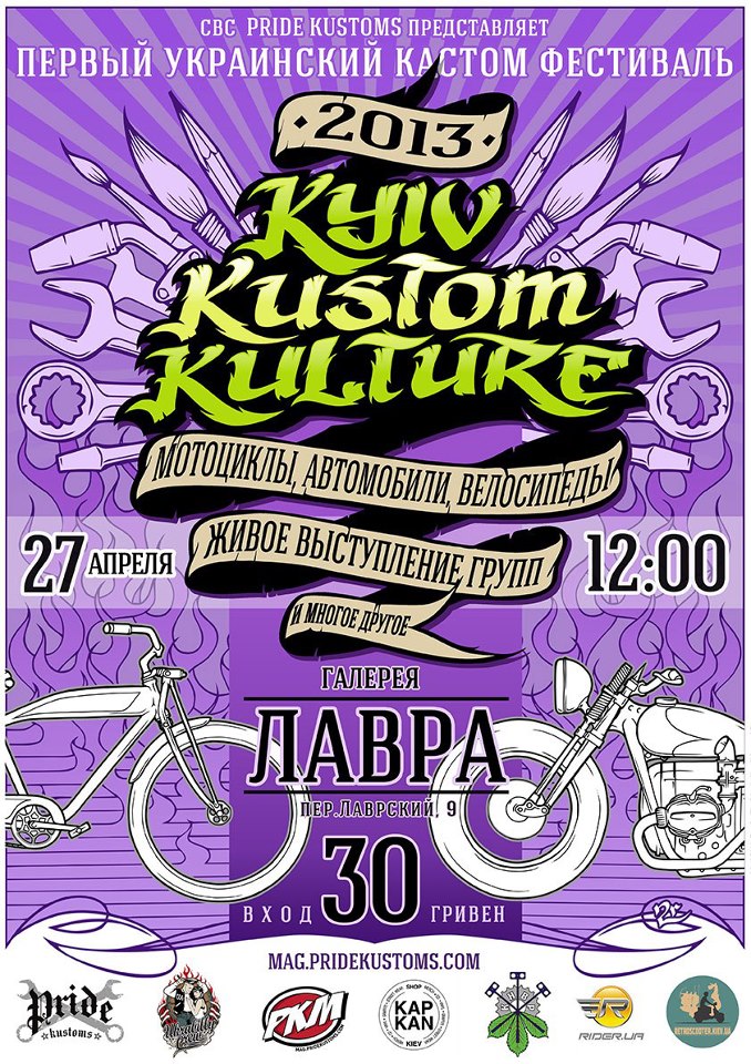 Дорогие друзья, мы рады пригласить вас на первый украинский фестиваль кастом культуры Kyiv Kustom Kulture. Фестиваль продолжает традиции велокастом шоу СБУ и расширяет его границы. В этом году фестиваль охватит не только велокастом сцену, но и авто и мото кастом. Ждем вас 27 апреля в Галерее "Лавра" с 12-00. Подробную программу фестиваля читайте в нашей статье. http://mag.pridekustoms.com/kustom/diary/vse-chto-vyi-hoteli-znat-o-kkk