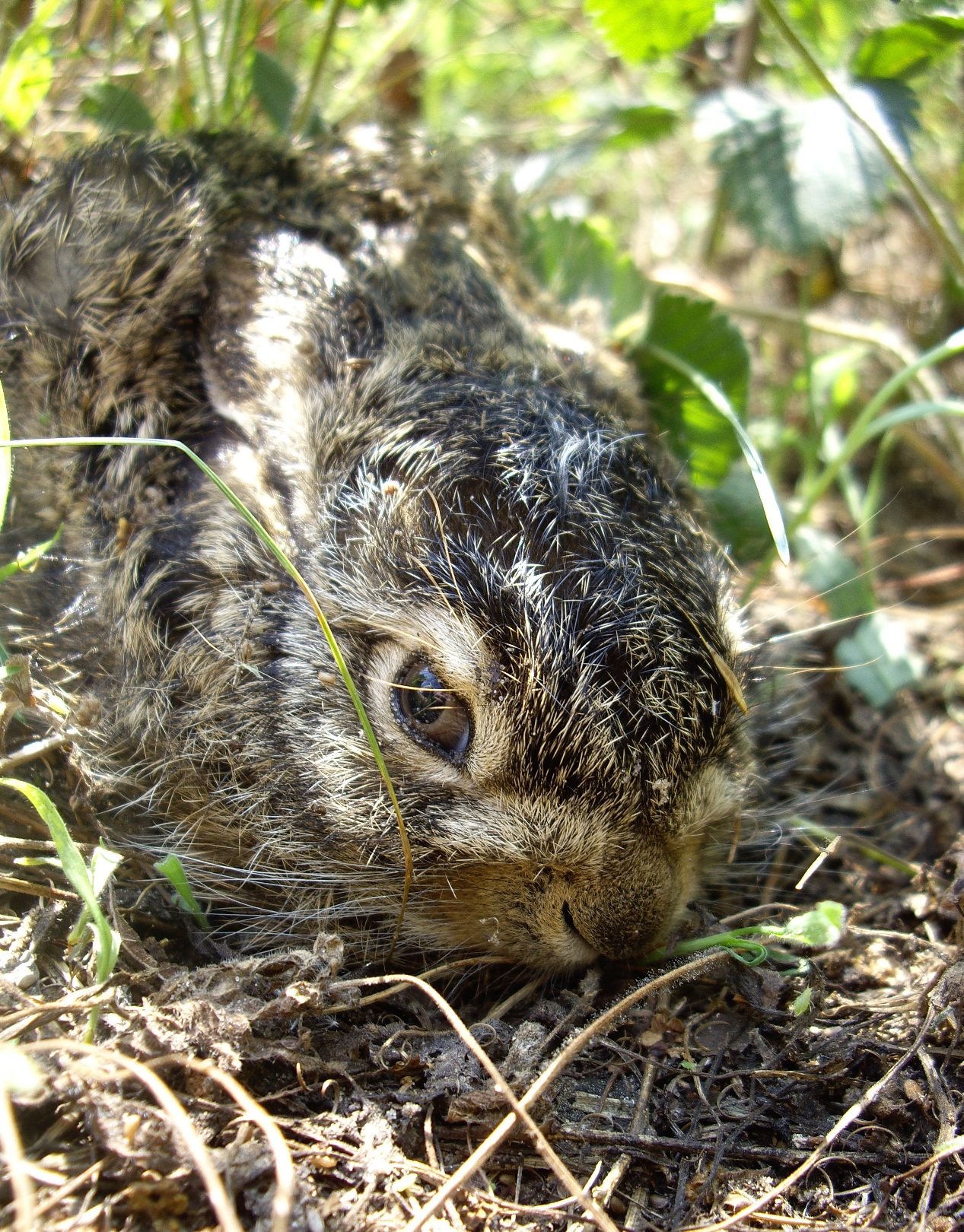 Ну, в общем, не катастрофа. Просто выполнял работы по извлечению сорняка из цветника. Гляжу - сидит! Сначала подумал - умер, ан нет - дышит и моргает. Руками не трогал, потому как знаю, что потом зайчиха к нему не подойдет. Заяц терпеливо ждал пока я бегал за фотоаппаратом в дом. Почти не дышал. Я его прикрыл потом травой, но все равно к вечеру он ушел. Или мама забрала.