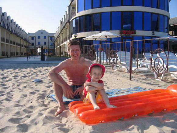 мы же жили в обычном №115 - на 1-м этаже - как раз напротив фонтана (его правда включали пару раз в день на 1-2 часа продолжительностью каждый раз)... на 1-м этаже жить очень удобно - входишь к себе в номер напрямую с улицы, без блужданий по подъездам и корридорам ... что интересно, номера на 3-м этаже наиболее дешевые (у них балкона нету), но зато есть отдельная вторая кровать (на 1 человека), на 2-м этаже в номерах (обычных, первой категории, в подобном жили и мы) только одна 2-х спальная кровать (кстати эти 2-х спальные кровати у них очень большие!), а на 1-м этаже есть дополнительное раскладывающееся кресло - для ребенка в самый раз... так что, если у вас 2-е детей и одно дите совсем малое (до 2-3-х лет), то вы смело можете брать номер однокомнатный первой категории (он раза в полтора дешевле за люкс), по моемУ мнению, оптимально бронировать номера на 1-м этаже, непарные, с 103-го до 117-го (115-й и 117-й напротив фонтана - супер вид из окна!) - это ближе к морю и дальше от дороги (вечером работает ночной клуб и шум может быть слышен + машинки ездят - хоть и небыстро из-за лежачих полицейских), и на этой стороне прямое солнце бывает только утром ... рекомендую вам бронировать те номера, чтоб окна однозначно выходили во внутренний дворик базы (этой буквы П), иначе вид из окна будет на трущобы рядом стоящих совковых баз или на дорогу... Пол в санузле, даже в номере 1-й категории - с подогревом, вода естессно круглосуточно и горячая в том числе, жаль из-за плохого качества - она с легким запашком... Завтраки - шведский стол в ресторане, который через дорогу над ихним ночным клубом - с 30июня цену подняли с 40 до 50грн и время сузили с 8.00 до 10.00 (главное вовремя зайти, а там можете и до 11.00 сидеть), а было ведь действительно 40грн. и вход до 11.00... с таким подходом скоро цена может стать и 60грн, а то и дороже тоже самое с изменением цен на проживание - те кто забронировали заранее у них - получат эту оговоренную цену, иначе можна приехать и обнаружить, что цены стали выше из минусов базы - слишком малая территория, им бы выкупить пансионат Затока (он через 1-2базы дальше - с огромной территорией, растительности там поболее тоже) и превратить в а-ля Турецкий отель с открытыми бассейнами, детскими площадками и т.п. из плюсов - от Киева на авто можно добраться за 4.5-5 часов, большинство авто припаркованных - с киевскими номерами... (парковка 12грн. сутки, на большинсктве близлежащих баз - 5, можна сэкономить :-))