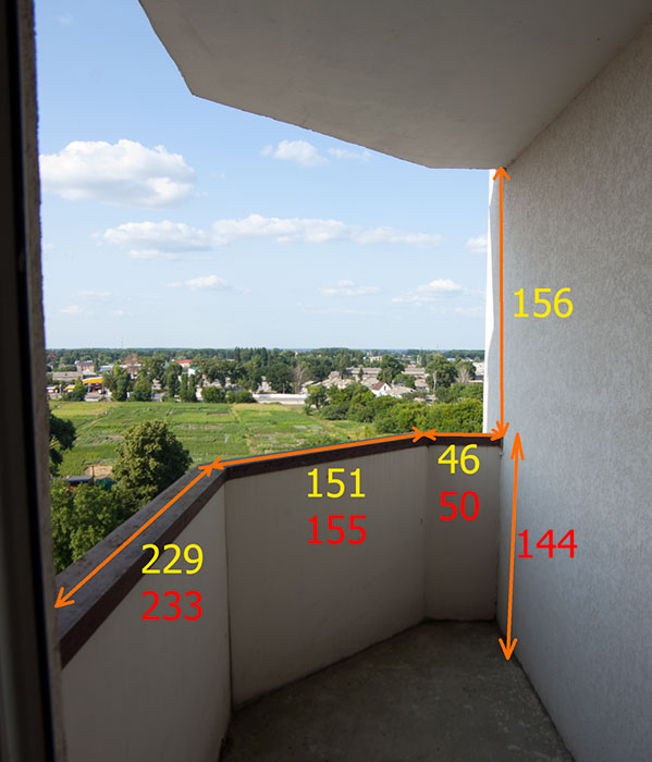 Надо в моей квартире утеплить снаружи и застеклить балкон. Размеры на фото, красным - под утепление (внешние размеры балкона и высота вниз до края), желтым — под остекление (по середине верха ограждения). Этаж — 9/9, перекрытия бетон, наружная стена балкона — силикатный кирпич плюс штукатурка, сверху — металл. полутавр(?). Стены дома — силикатный кирпич плюс 10 см. пенопласта.