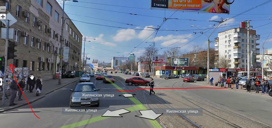 0 (не отображено) -- при въезде на жилянскую никакого знака главной дороги нет 1 -- есть знак "пересечение с трамвайной линией" 2 -- светофор на дальней стороне очерчивает полные границы перекреста со светофором 3 -- линия трамвая дальше перекрестка со светофорным регулированием