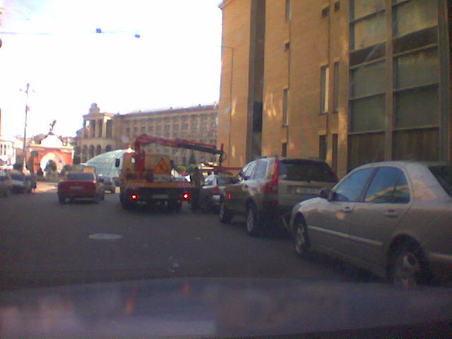 Спускаемся сегодня от Софии к Крещатику - и попадаем в конкретную такую тянучку. Движется с трудом. Думаю, что такое? Приближаемся к источнику - и вот оно: эвакуатор утаскивает практически никому не мешающий автомобиль (да там их всё равно полно припарковано), зато сам занимает ряд, отсюда и тянучка. Это в субботу-то ближе к вечеру! Ну умудряются... Интересно, поборники такого способа борьбы с неправильной парковкой могут объяснить, кому стало легче ездить в результате этой конкретной эвакуации? А вообще день дурной, аварий по городу куча. На Черновола - побитая иномарка (кажется, из недорогих), ВАЗ 05 или 07 после переворота, ГАИ и 3 скорых...