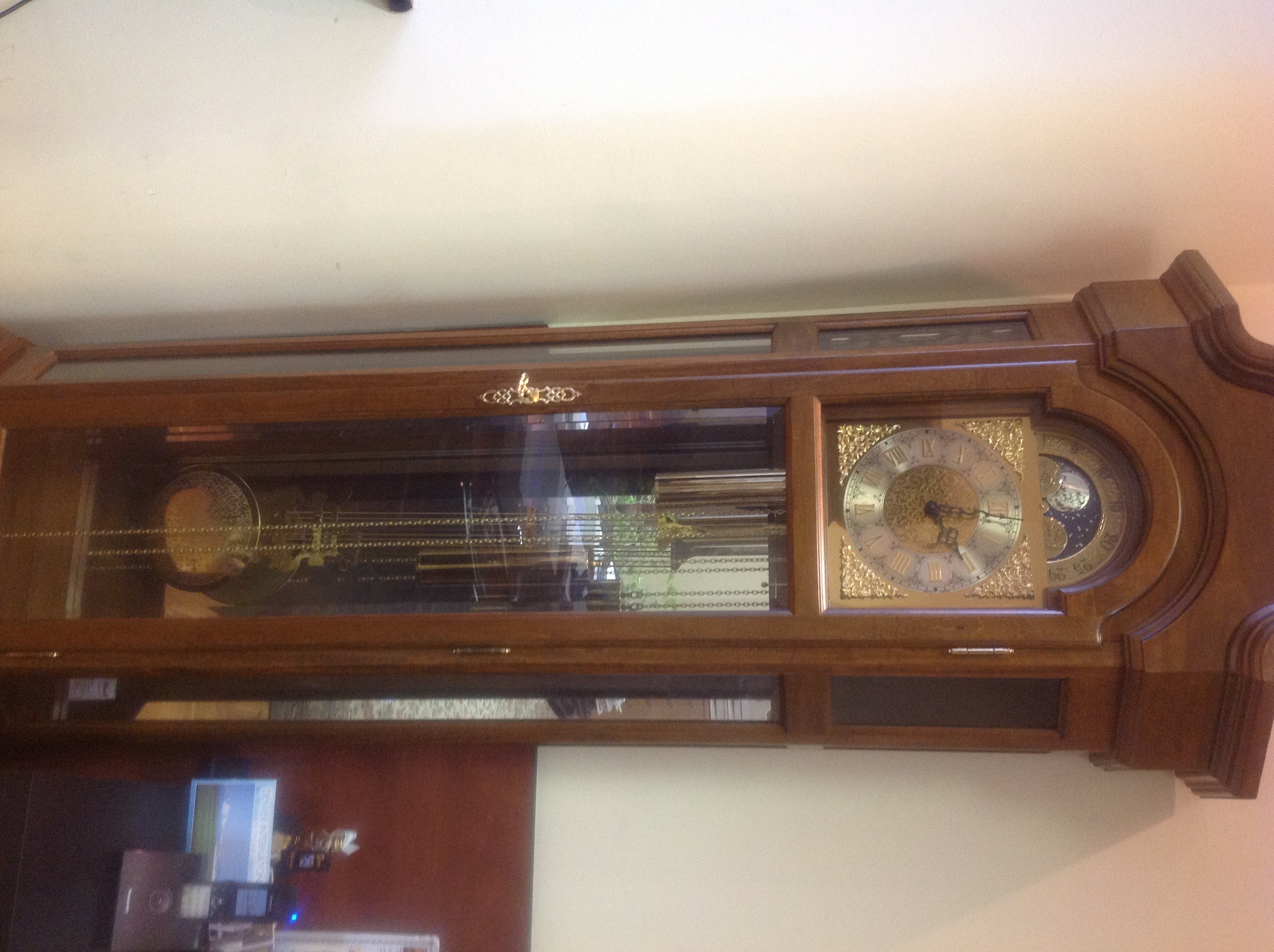 Напольные угловые часы Hermle. Производитель Германия. Модель: 01052-03045 Механизм: Механические с цепным подвесом гирь, заводятся на 8 дней. Золотистый полированый маятник. Материал корпуса: дерево (цвет: орех античный). На циферблате римские цифры. Мелодия Westminster каждые 1/4 часа. Почасовой бой. Ручное и автоматическое отключение мелодии и боя в ночное время суток. Также в часах есть лунный календарь. Гарантия на часы Hermle 01052-03045 - 60 месяцев