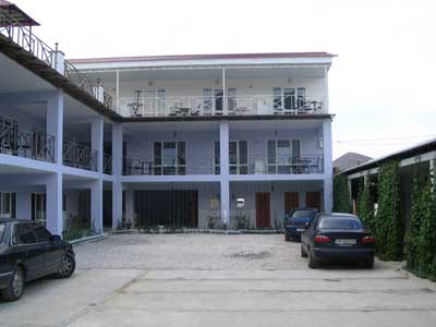 Если смотреть на снимок, то правая сторона это 1 этаж, однокомнатные номера, двухспальная кровать, шкаф, телек лыжи ивообщем все, удобства во дворе, на фотке видны впереди 3 двери и зеркала, там умывальники, 2 душа, 2 туалета, людей немного ими пользуются ибо другая половина номеров двухкомнатные, с удобствами внутри. Мой номер стоит сейчас 30уе сутки. 2-х комнатные по полтиннику, но туда легко 4-5 чел влазят.