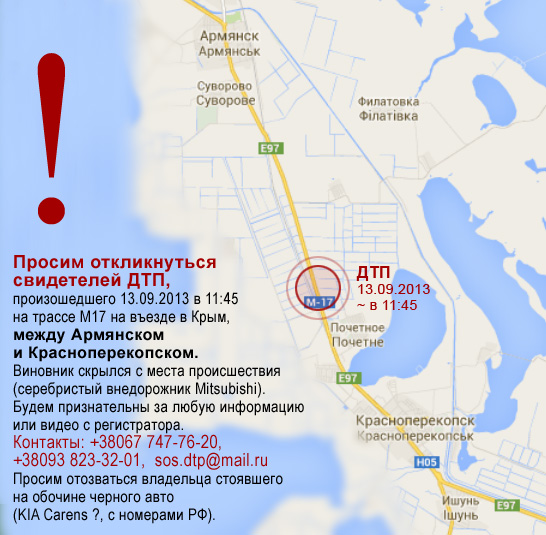 Просим откликнуться свидетелей ДТП, произошедшего в 11:45 на трассе М17 на въезде в Крым, между Армянском и Красноперекопском. Виновник скрылся с места происшествия (серебристый внедорожник Mitsubishi). Будем признательны за любую информацию или видео с регистратора. Контакты: +38067 747-76-20, +38093 823-32-01, sos.dtp@mail.ru Просим отозваться владельца стоявшего на обочине черного авто (KIA Carens ?, c номерами РФ). Спасибо.
