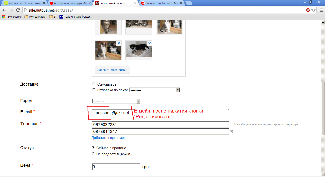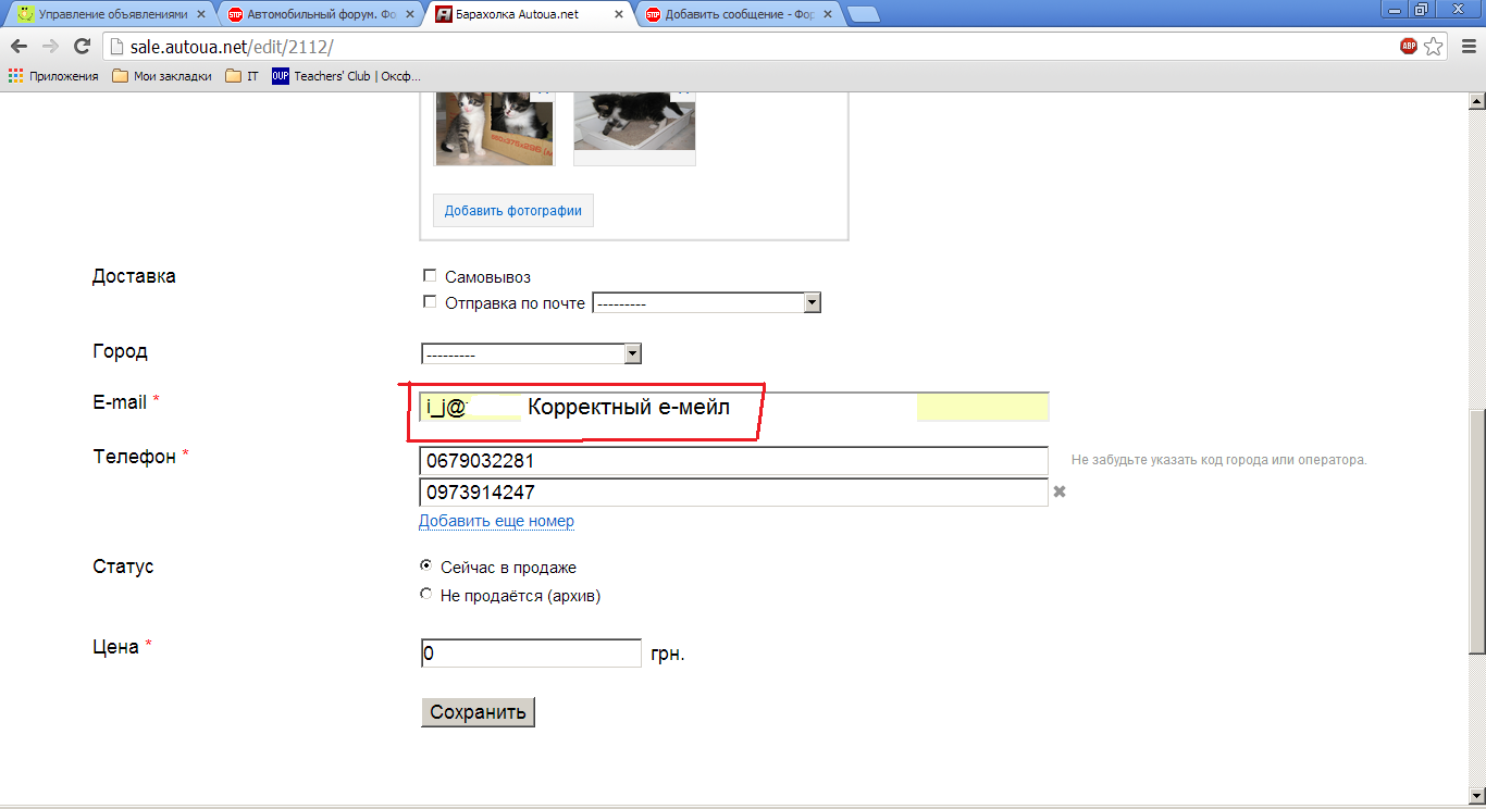 Предусловия: -У пользователя есть объявление. - Поле Е-мейл заполнено корректно.