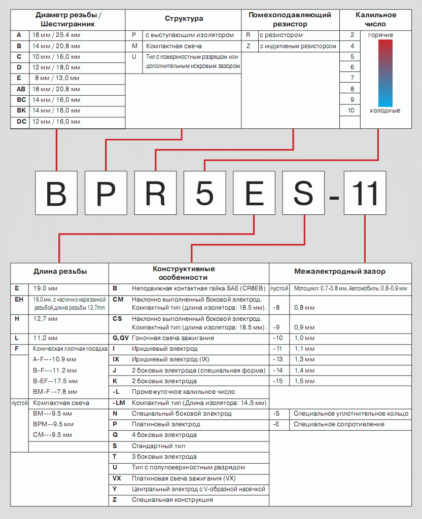 Маркировка свечей NGK для бензиновых двигателей (от производителя).