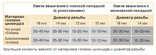Моменты затяжки свечей NGK для бензиновых двигателей.