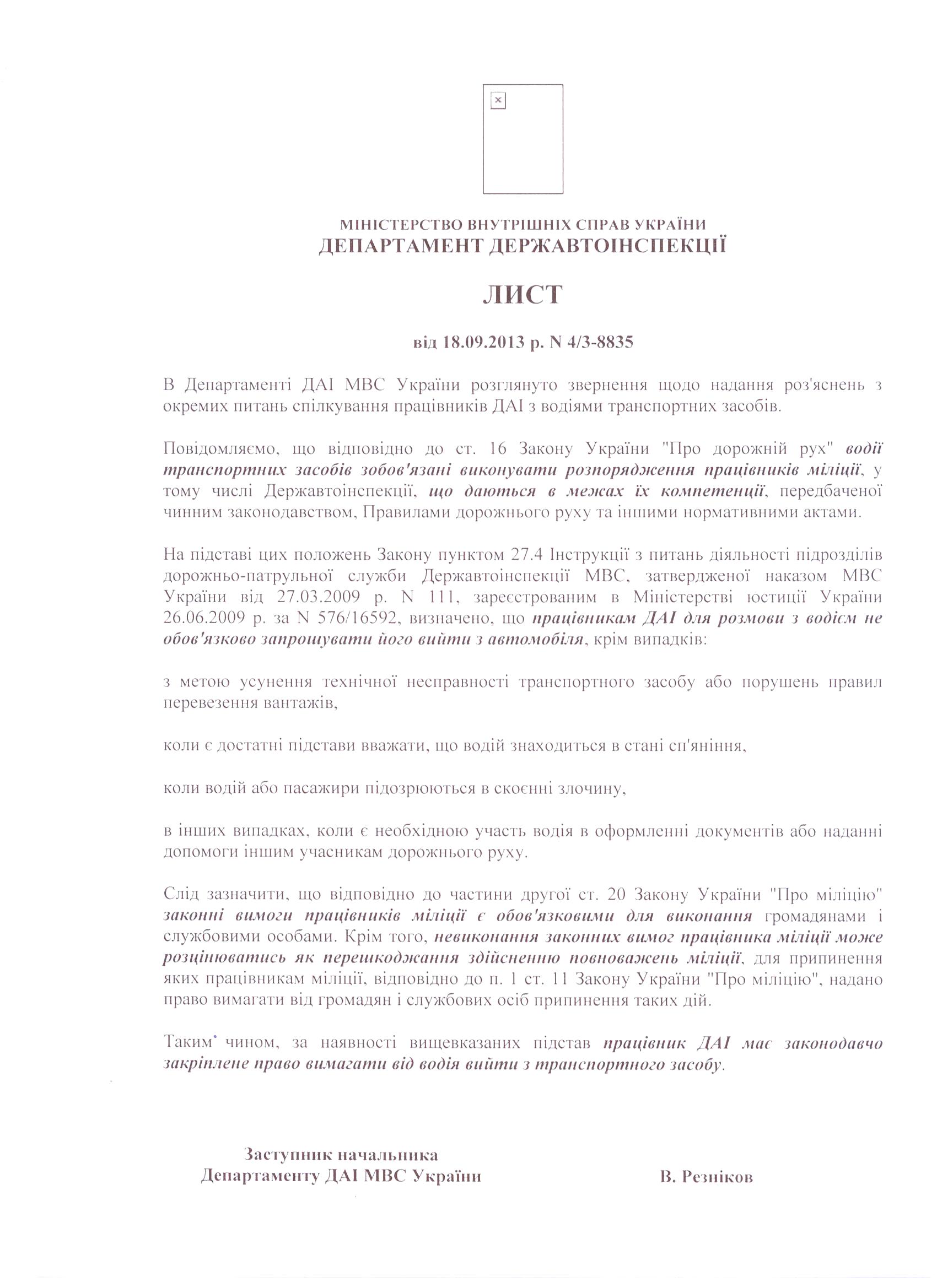 У випадку невиконання водієм законних вимог працівника міліції, в тому числі ДАІ, дії водія можуть розцінюватись як перешкоджання здійсненню повноважень міліції, оскільки відповідно до частини другої ст. 20 Закону України "Про міліцію" законні вимоги працівників міліції є обов'язковими для виконання громадянами і службовими особами.