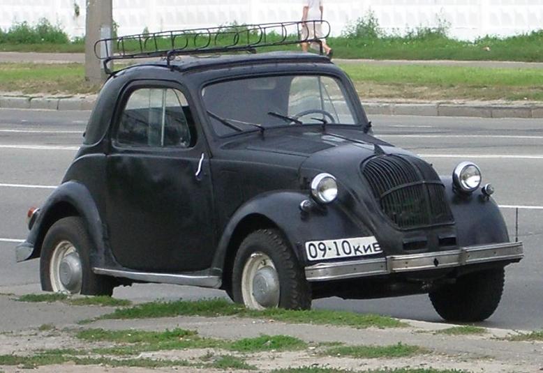 (***) Где видели? В каком районе? У меня впечатление, что это старая "круглая" мотоколяска для инвалидов, кажется, С-1 называлась. (В фильме "Операция Ы": "Где инвалид?" "Я инвалид!") Но она изначально была открытая, а тут на неё, похоже, наварили металлический верх, причём, такое впечатление, что задняя часть этого верха представляет собой заднюю часть крыши довоенного "Мерседеса-170". Ну и свякие другие доработки кузова. Это первая версия, ещё подумаю