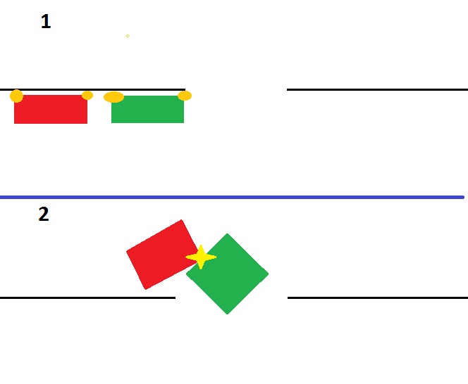 2. Зелений, впевнившись, що маневр буде безпечним (немає ні зустрічних авто, ні баранів, що обганяють) починає маневр. Червоний же вирішує, що він самий хитрий, а зеленому авто тормоз і зрізає кут.