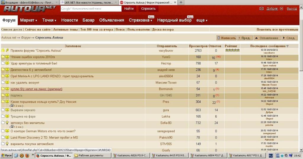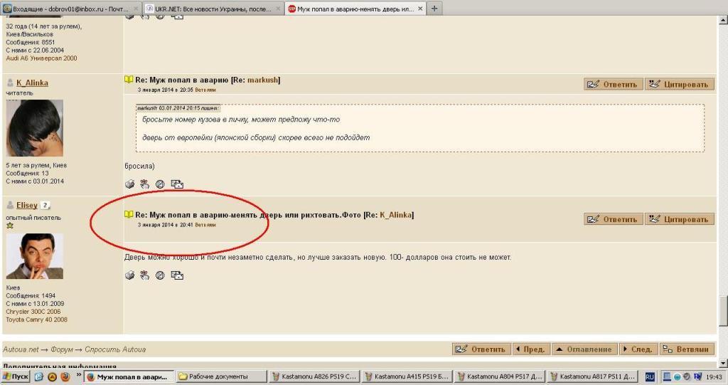 Добрый вечер. Глючит форум. Увидел тему "Муж попал в аварию", скрин сделал. Когда захожу в "Спросить Автоуа", там этой темы нет, скрин сделал. По первому скрину видно, что последний ответивший Краев, а по последнему скрину - Елисей.