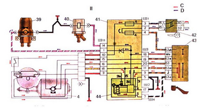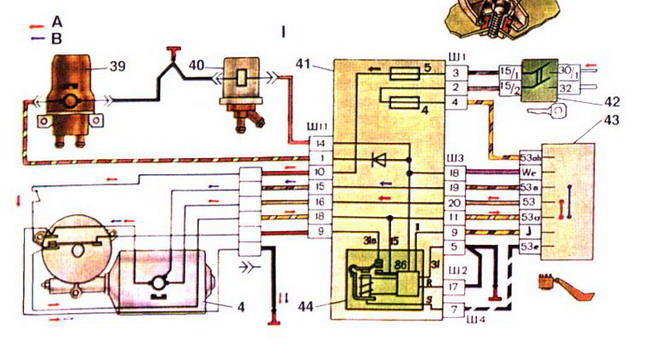 Это к рисунку: ................. 39. Электродвигатель насоса смывателя; 40. Электромагнитный клапан смыва ветрового стекла; 41. Монтажный блок; 42. Выключатель зажигания; 43. Переключатель очистителей и омывателя стекол; 44. Реле очистителя ветрового стекла; 45. 1.Схема включения 1-й и 2-й скорости очистителя; A -(малая) скорость очистителя; B -(большая) скорость очистителя;