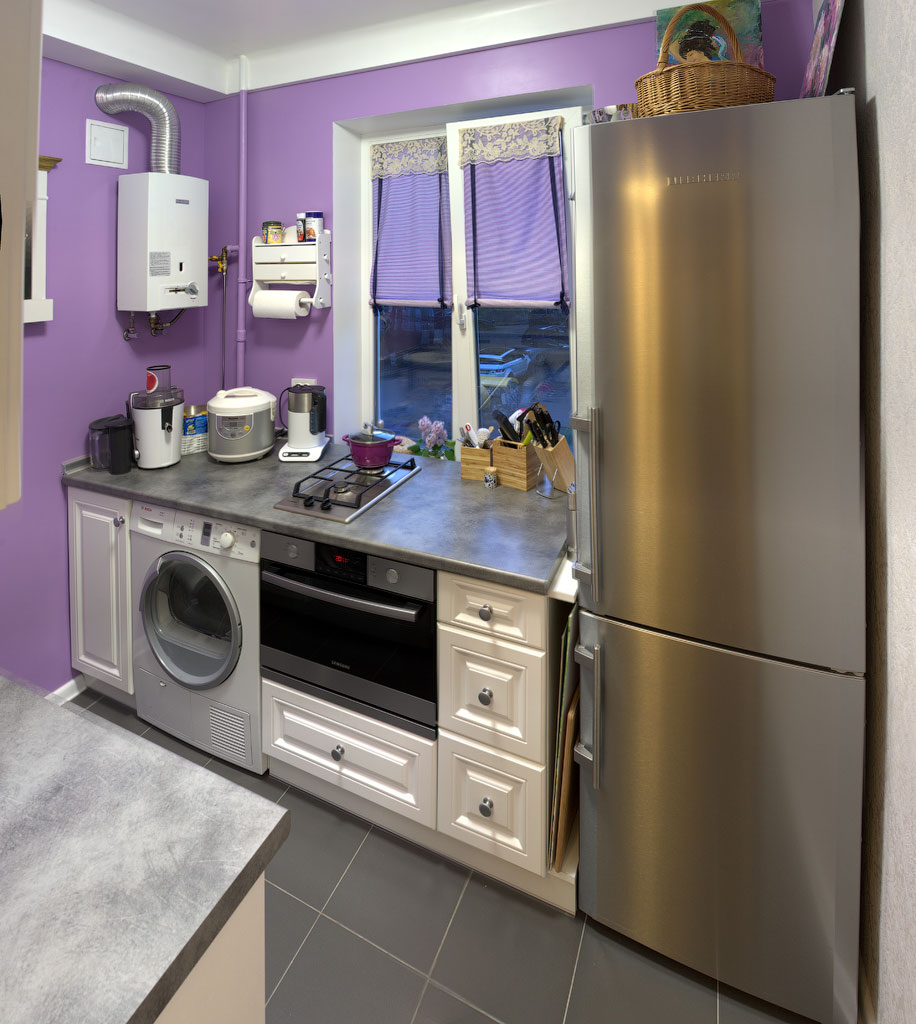 А подсказки следует искать в примерах готовых решений гостиниц-апартаментов. Вводные данные одинаковы: разместить всю необходимую бытовую технику на небольшой площади. Сейчас под встроенной электроплитой можно разместить посудомойку либо мини-холодильник. В копилку идей, см. примеры на фото (вместо микроволновки можно запросто поставить духовку с функцией микроволновки ):