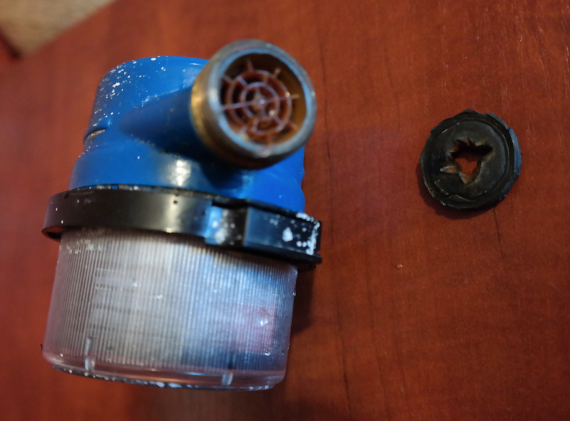 Началась история давно, развалился кран на вводе холодной воды в квартиру. Небольшой потоп, вовремя перекрыли, жековский сантехник заменил кран за плату. В последне время(прошло лет пять) напор холодной упал до нетерпимой величины, решил посмотреть в чем дело. Открутив счетчик, обнаружил такую hand made прокладку, отверстие которой практически перекрывалось окалиной. Все почистил, прокладку "доработал напильником"