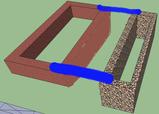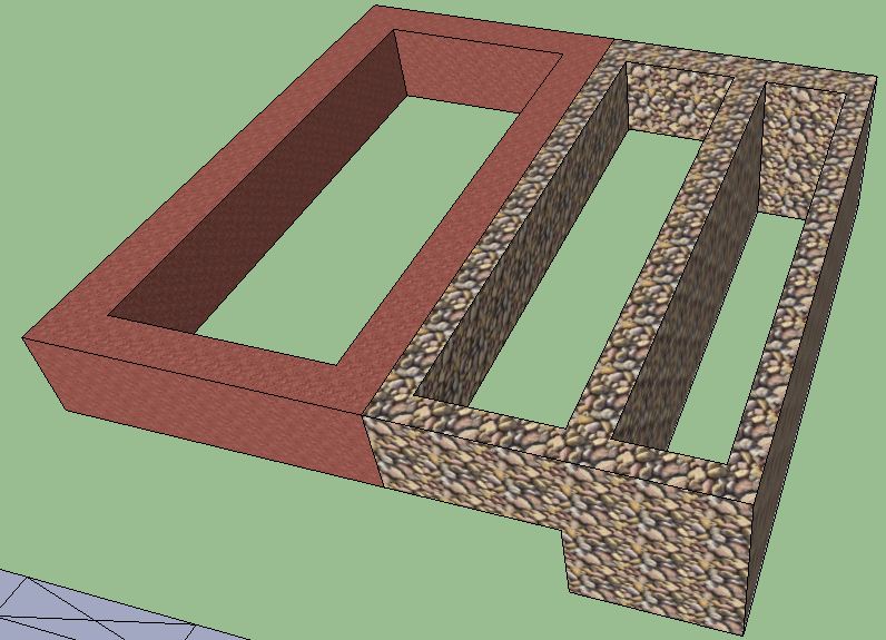 Вот, примерно нарисовал, что задумано сделать. Бордовым цветом обозначен существующий фундамент, каменной текстурой - новый. Более глубокая часть справа. Вообще это будет пристройка, под которой хотелось бы реализовать небольшой погреб с как можно меньшей трудоемкостью. Я находил несколько решений по углублению существующего фундамента - закладками или с помощью столбов - очень сложно.