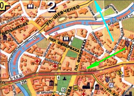 Вот кусочек карты. Голубой стрелкой обозначено начало Белгородского спуска (они у меня на разных листах). Зеленой - пр.Московский 47