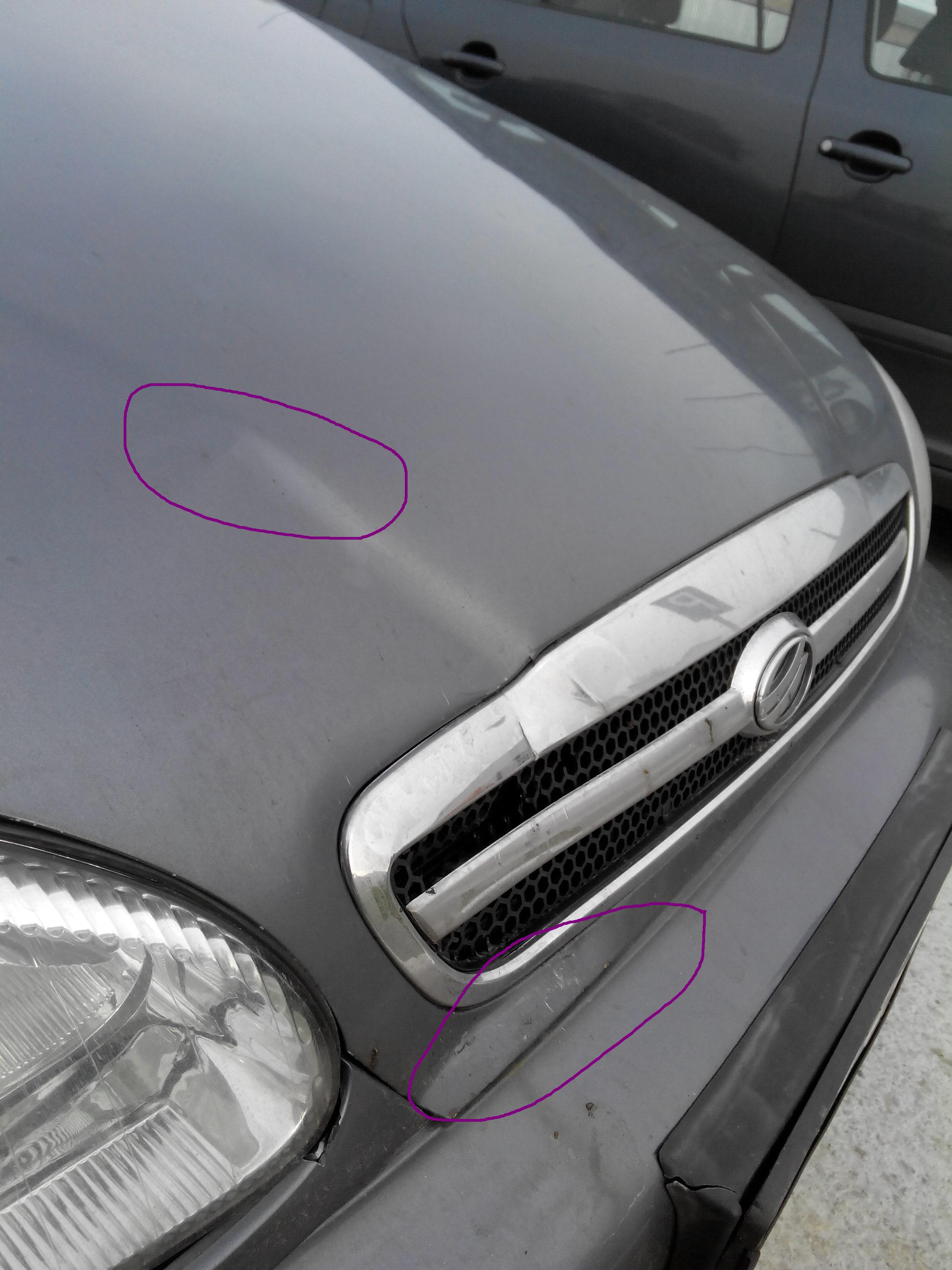 Сверху небольшой излом на ребре (обвел место излома). Снизу вмятина. Интересует только капот. Можно в личку.