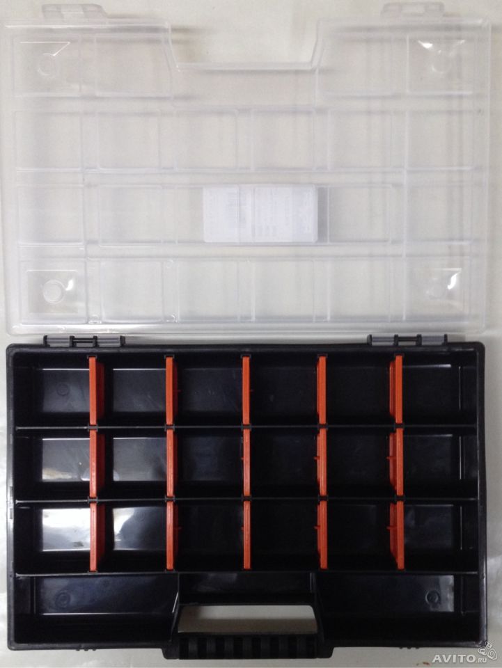 В подобных органайзерах слабоваты перегородки, и особенно прозрачная крышка. Вот, проверенный годами и гайками с болтами: