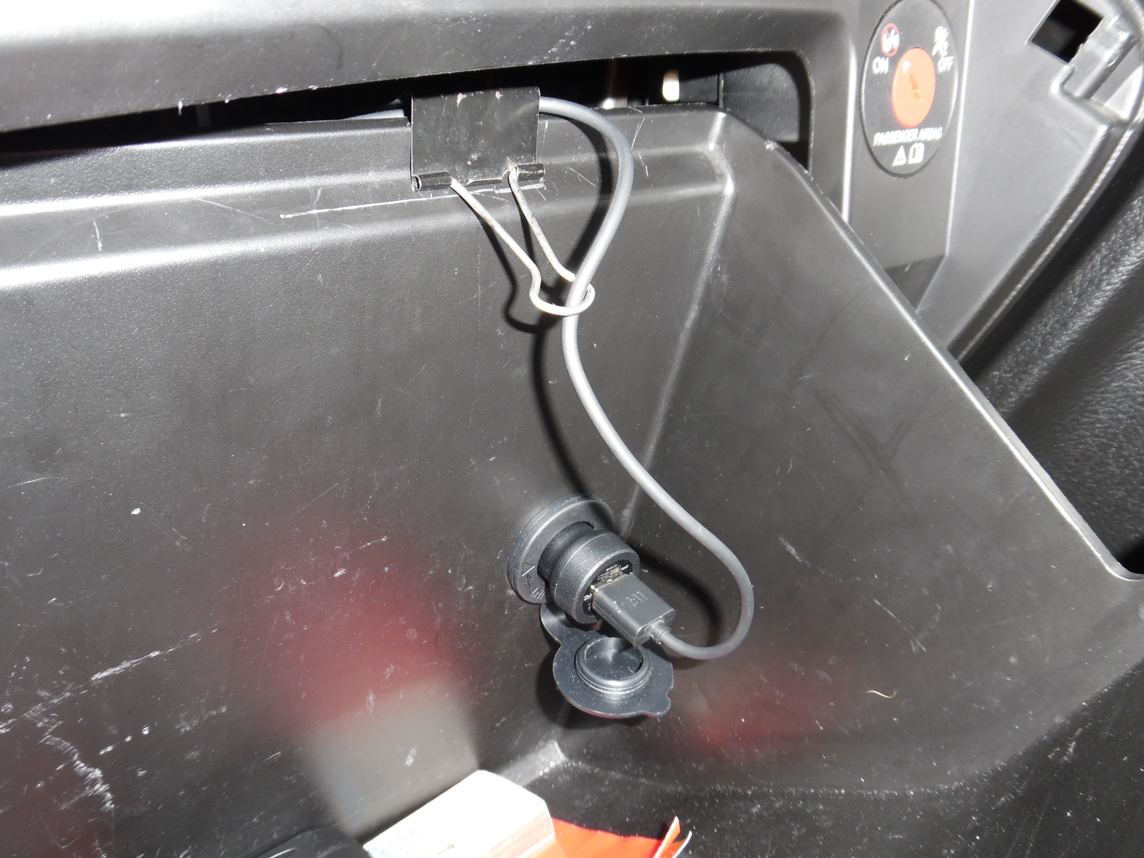 Подарували мені відеорегістратор, закріпив його традиційно, протягнув дроти під обшивкою, під планкою правої стойки, під панель приладів, але те, що він зайняв єдине гніздо прикурювача, було незручно і неестетично. Отже прикупив за 50 грн. на базарі ще одну розетку, і врізав її просто в задню стінку бардачка. Місце врізки визначив емпиричним шляхом - приліпив муляж на пластилін, слідкуючи, щоб він не впирався в кожух фільтра. Заживився від рідної розетки - для цього довелося зняти центральний обдув і магнітолу, звідти зняв з фішок дріт, та впаявся до нього.